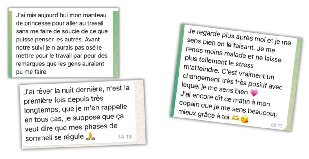 "Je me sens très chanceux d’avoir suivi EMPONI, car cela m’a aidé à mieux me comprendre et à améliorer mon bien-être. Et tu continues à m’aider énormément semaine après semaine." — D.S